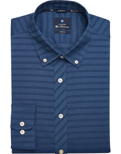 Add a punch of color and pattern to your look with this button-down collar dress shirt by Ben Sherman. A subtle, modern plaid pattern is the perfect backdrop to your favorite ties and sport coats. Slim Fit is slim and tapered across the chest, shoulders, armholes, waist and sleeves without compromising on comfort. Recommended for more triangle body types (broad shoulder and chest, narrow waist and hips).