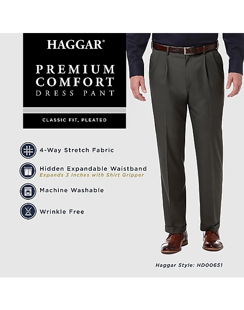 - 78% polyester 22% recycled polyester|Wrinkle-resistant|Stretch fabric|Expandable waistband|Shirt gripper for a neat look|Pleat front|Classic Fit|Haggar Premium Comfort|