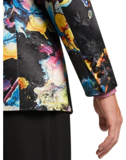 Make a bold, avant-garde statement with this finely crafted dinner jacket by Paisley & Gray. Featuring bright, colorful swirling patterns of art paired with a black satin peak lapel, it is tailored with a Slim Fit to offer a sleek, modern look for your next special occasion.