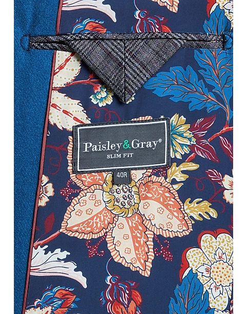 - 50% wool 40% polyester 10% other|Two button|Notch lapel|Side vents|Contrast lining|Coordinating pieces sold separately|Slim Fit|Paisley & Gray|